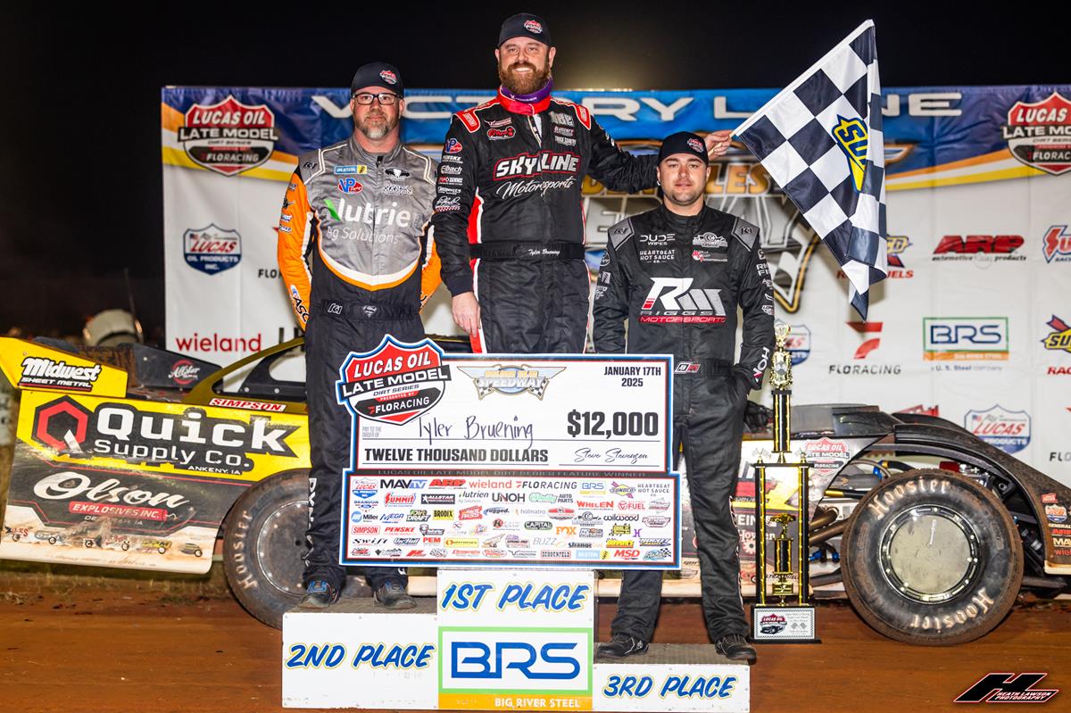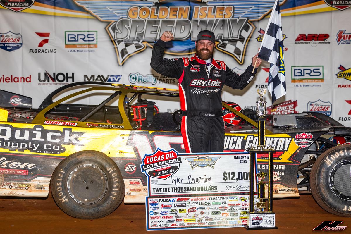 DECORAH, Iowa (1/20/25) – Tyler Bruening struck Lucas Oil Late Model Dirt Series gold this past weekend with a $12,000 triumph in Friday’s Super Bowl of Racing opener at Golden Isles Speedway aboard his Skyline Motorsports / Bruening Rock Products / VG Performance No. 16 Longhorn Chassis Late Model.